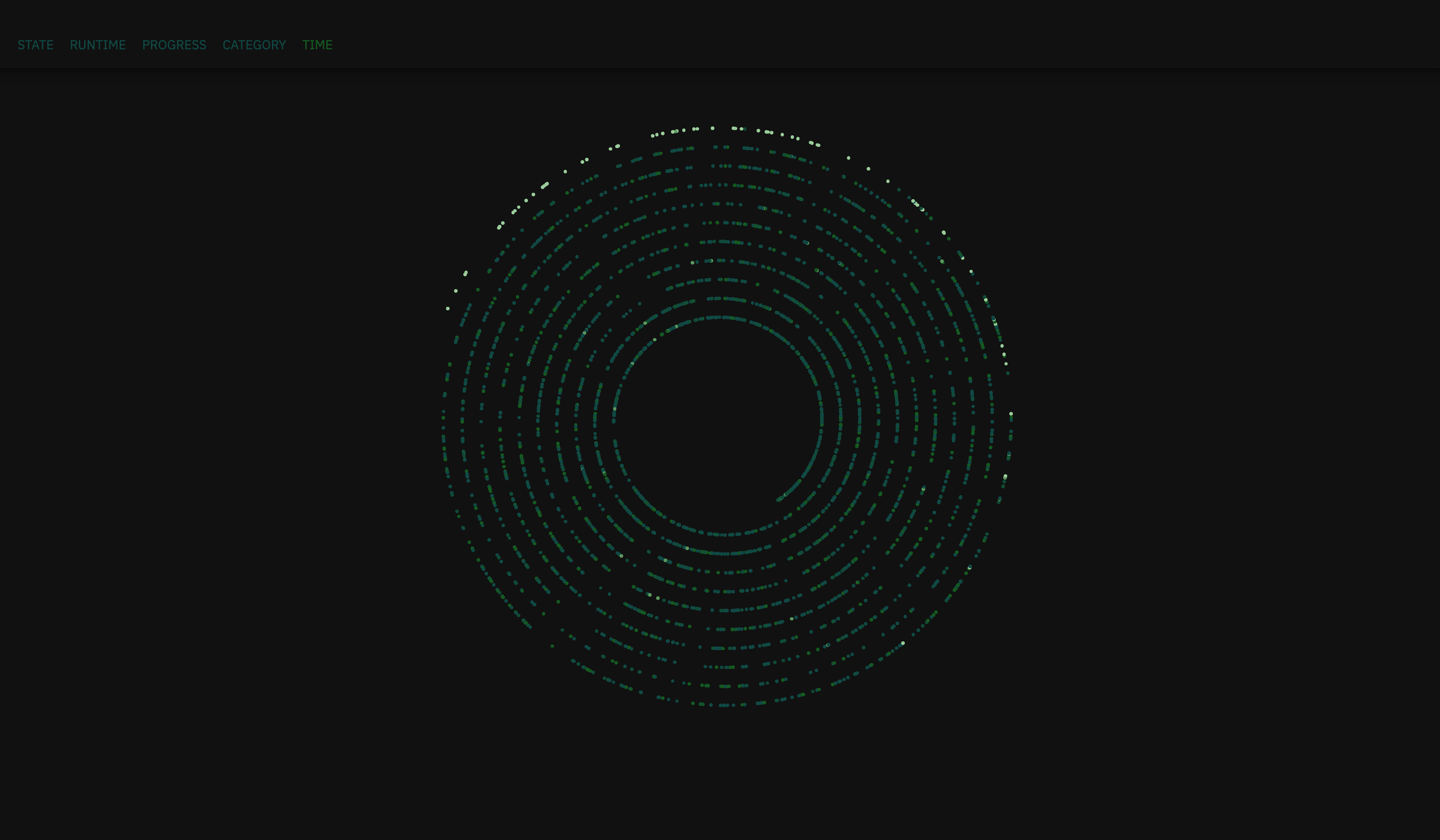 Die fünfte und letzte Datenvisualisierung soll nochmals den zeitlichen Aspekt in den Fokus rücken. Alle 4.200 Projekte werden auf einmal in einer Zeitspirale dargestellt. So soll eine genauere und ungefilterte Übersicht über alle Projekte entstehen. In dieser Visualisierung lassen sich Zusammenhänge zwischen Projektlaufzeit und Finanzierungserfolg noch deutlicher erkennen.