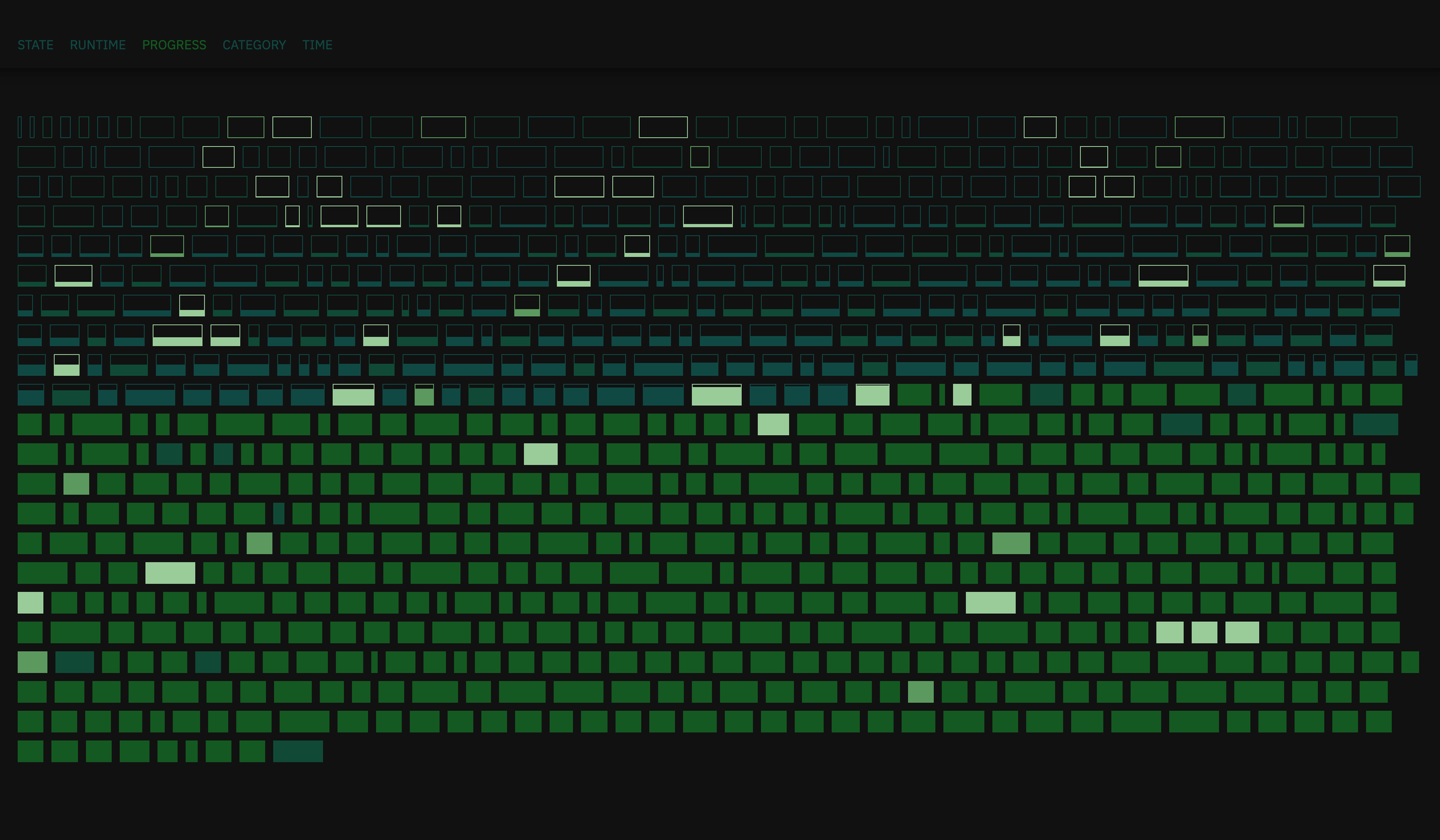 Der Fortschritt wurde auf die Höhe der einzelnen Projektrechtecke gemappt und umfasst den Wertebereich von 0 bis 1, inklusive aller Zwischenstufen. In dieser Visualisierung wird zum Projektstatus und zur Laufzeit noch der Status addiert. Somit sind alle drei Basiseigenschaften eines Projektes vorgestellt und den Betrachter*innen bekannt.